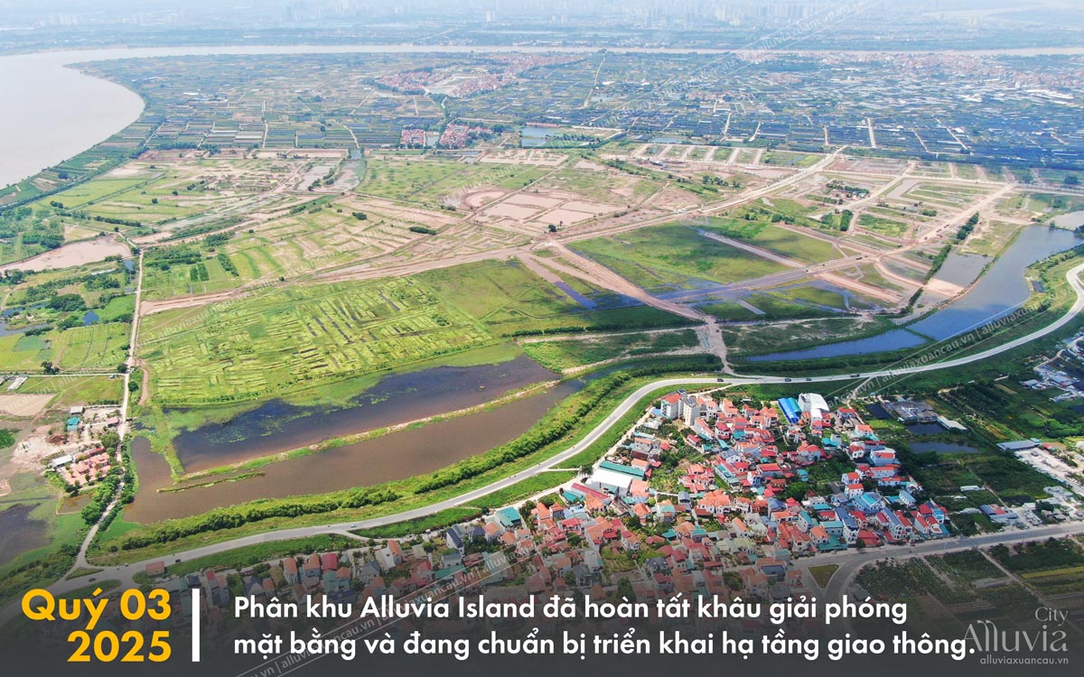 Ngay trong quý 3/2025 phân khu Alluvia Island đã có những thay đổi lớn trên công trường. Hai tuyến giao thông huyết mạch là trục đại lộ nội khu và đường kết nối tuyến vành đai 3 đã dần thành hình. Không gian thiên nhiên với hồ cảnh quan cũng đã được triển khai và gần như hoàn tất.